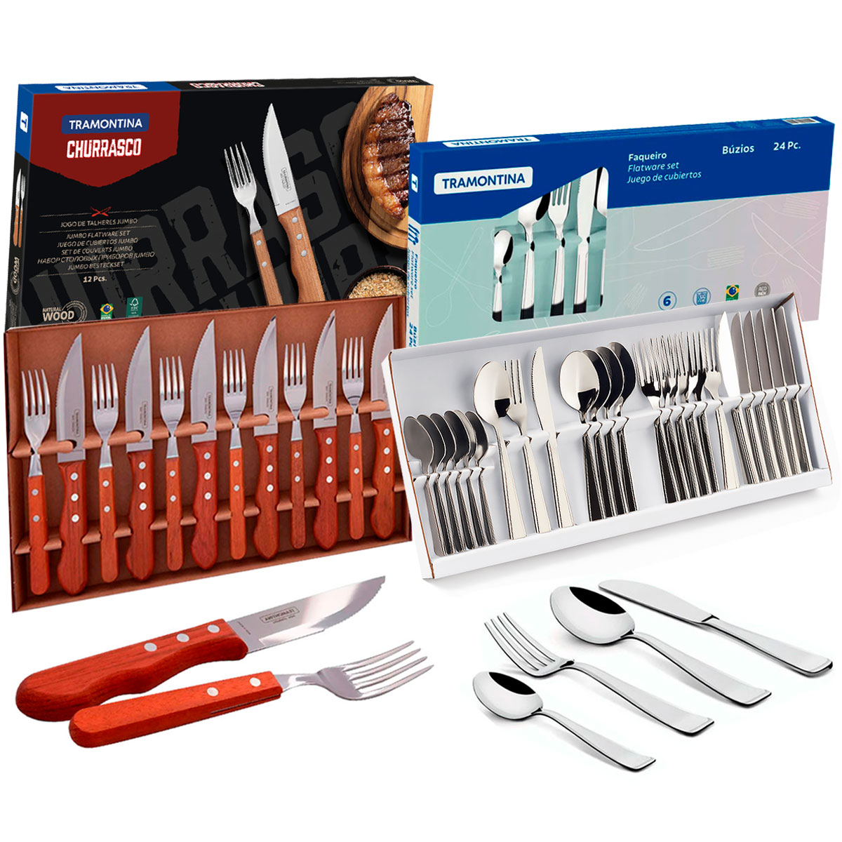 - Componentes: Facas de Mesa - Facas para Churrasco - Garfos de Mesa - Garfos para Churrasco - Colheres de Mesa e Colheres para Chá.