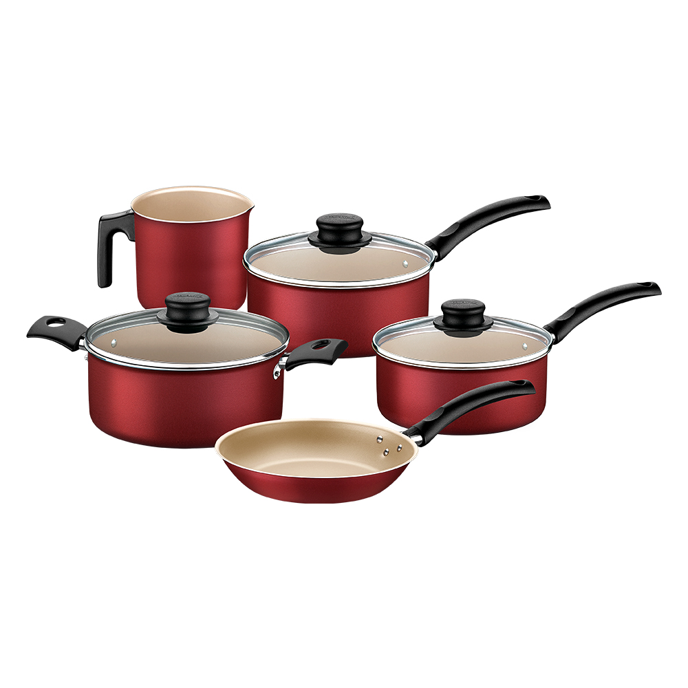 Com o jogo de panelas Tramontina Turim em alumínio com revestimento interno e externo em antiaderente Starflon Max vermelho 5 peças você vai ter a melhor opção para preparar suas receitas com praticidade e qualidade. Desenvolvidas para uso diário, as peças são produzidas em alumínio com revestimento interno e externo em antiaderente Starflon Max, características que proporcionam um cozimento rápido e uniforme dos alimentos, evitam que eles grudem na superfície, as tornam fácil de limpar e não prejudiciais a sua saúde. Os cabos e alças são em baquelite e os pegadores das tampa em nylon, materiais que não aquecem e proporcionam um manuseio muito mais confortável e seguro. Um jogo durável, que pode ser lavado na máquina de lavar louças e que acompanha tampas de vidro temperado com bordas de aço inox, que auxiliam e facilitam o preparo das receitas!