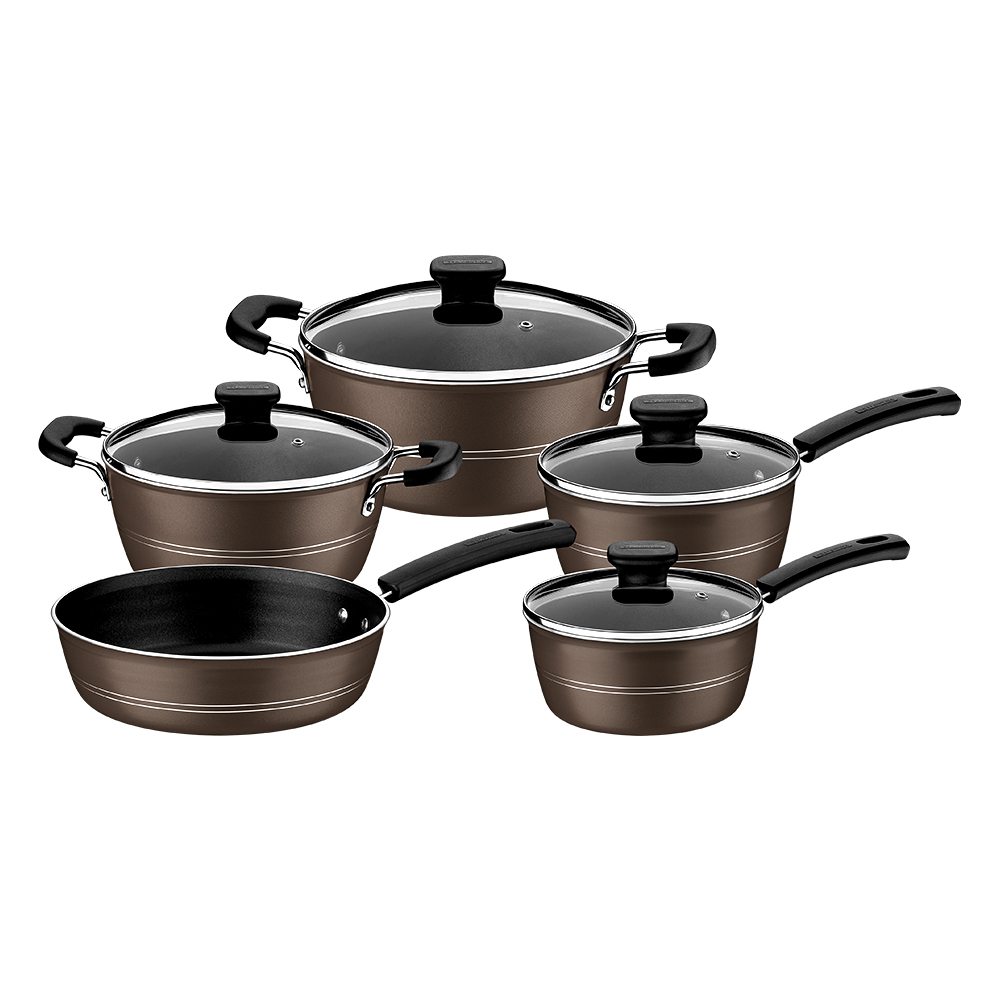 O jogo de panelas Tramontina Sicília em alumínio com revestimento interno e externo antiaderente Starflon Excellent avelã 5 peças vai garantir uma cozinha equipada com utensílios de alta qualidade e eficiência! Suas peças são produzidas em alumínio com revestimento interno e externo de antiaderente Starflon Excellent, características que proporcionam o cozimento uniforme dos alimentos, evita que eles grudem em sua superfície e as torna mais duráveis. Suas panelas e caçarolas vem com tampa de vidro temperado com saída de vapor e borda de aço inox e seus cabos, alças e pegadores são em material antitérmico e garantem um manuseio muito mais confortável e seguro. Elas ainda são fáceis de limpar e podem ir à máquina de lavar louças, otimizando sua rotina na cozinha! Pode ser utilizada nos fogões: gás, elétrico e vitrocerâmico - resistência elétrica.