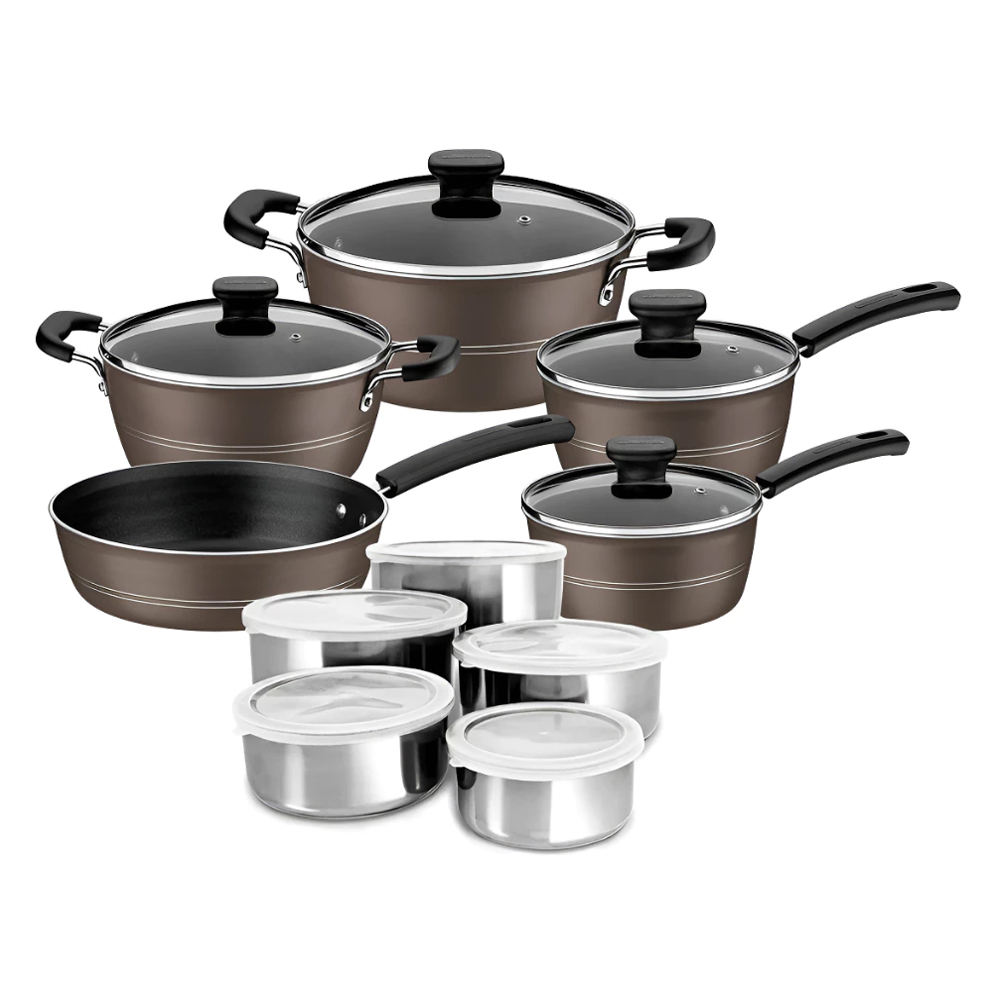 O Jogo de Panelas Tramontina Sicília em Alumínio com Revestimento Interno e Externo Antiaderente Starflon Excellent 5 Peças é a escolha perfeita para quem deseja levar beleza e funcionalidade para sua cozinha. Produzidas em alumínio com revestimento interno em antiaderente Starflon Excellent, suas peças proporcionam um cozimento uniforme dos alimentos e evita que eles grudem em sua superfície, além de ser mais durável. Seus cabos, alças e pegadores são antitérmicos e proporciona um manuseio mais seguro e confortável. As panelas e caçarolas vem acompanhadas de uma tampa de vidro temperado com bordas em aço inox e saídas de vapor, que facilitam a visualização dos alimentos durante o preparo. Elas são ainda muito fáceis de limpar e podem ir à máquina de lavar louças, facilitando sua vida na cozinha!